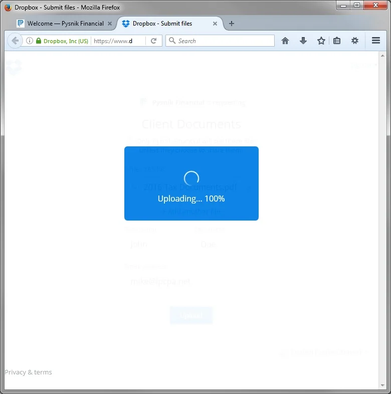 We are excited to announce a new option for our clients - secure file uploading via Dropbox. For those of you who prefer, we are still happy to accept documents via mail, private delivery services like UPS or FedEx, as well as hand-delivery. For security purposes we do not advise sending any sensitive information via regular, unencrypted email unless the documents themselves are password protected. We value your privacy and security.
