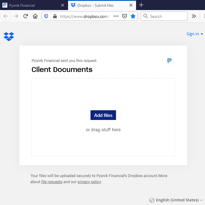 Do not click the "Sign In" link in the upper right unless you already have a Drop Box account and want to send Pysnik Financial something that is stored in your personal account. You do not need an account to use this service with our office.